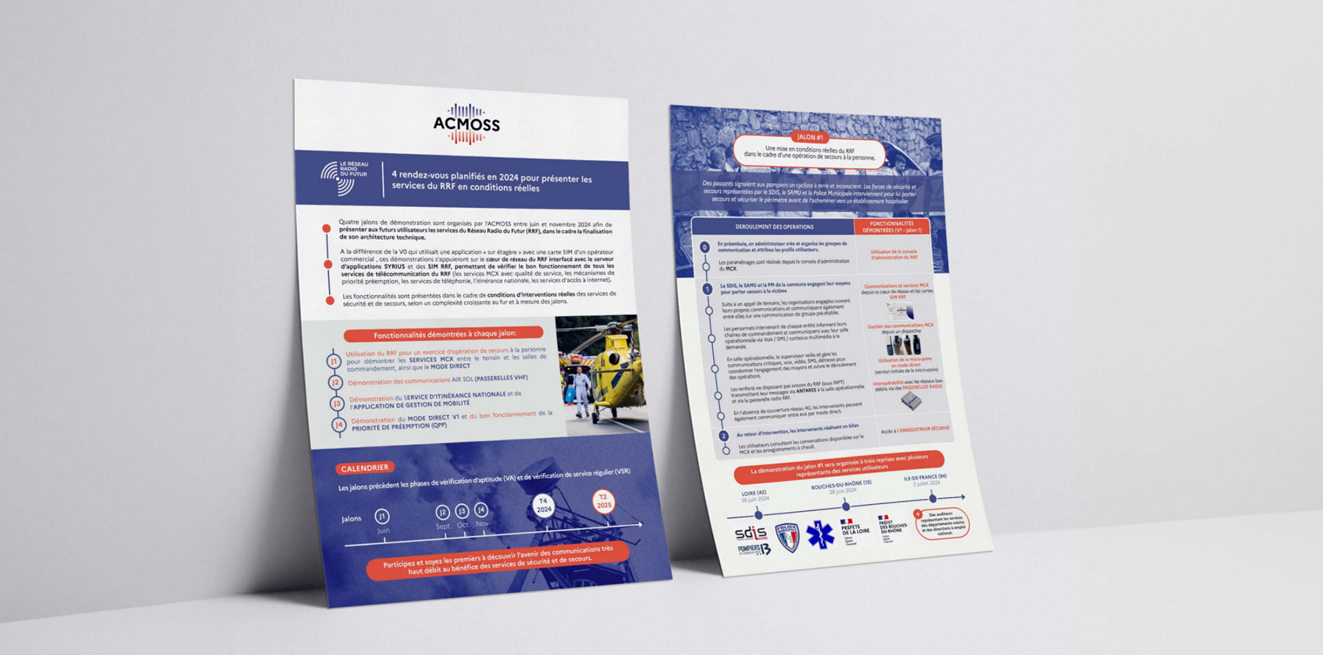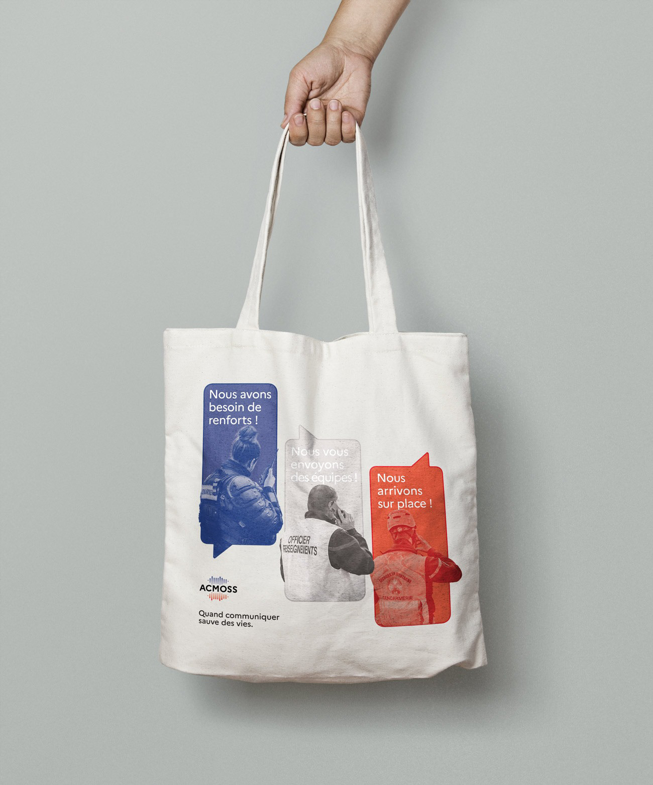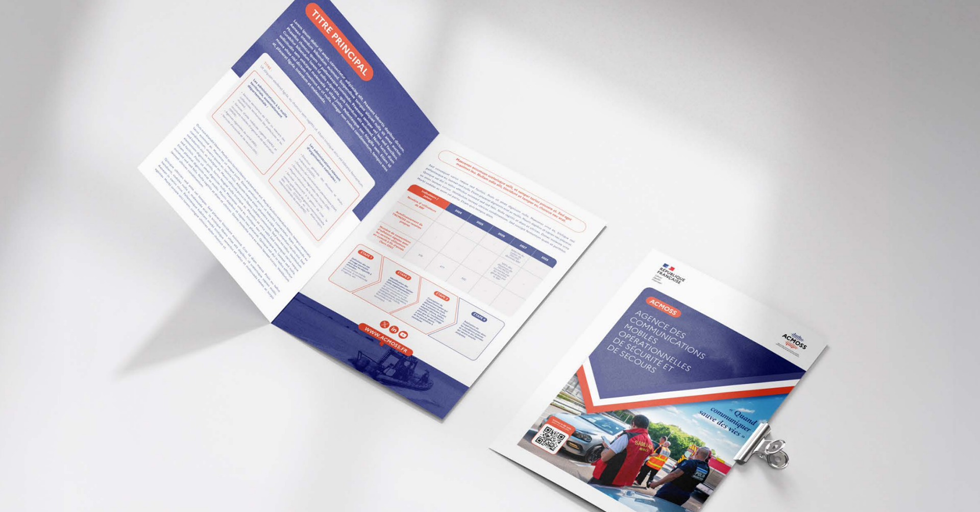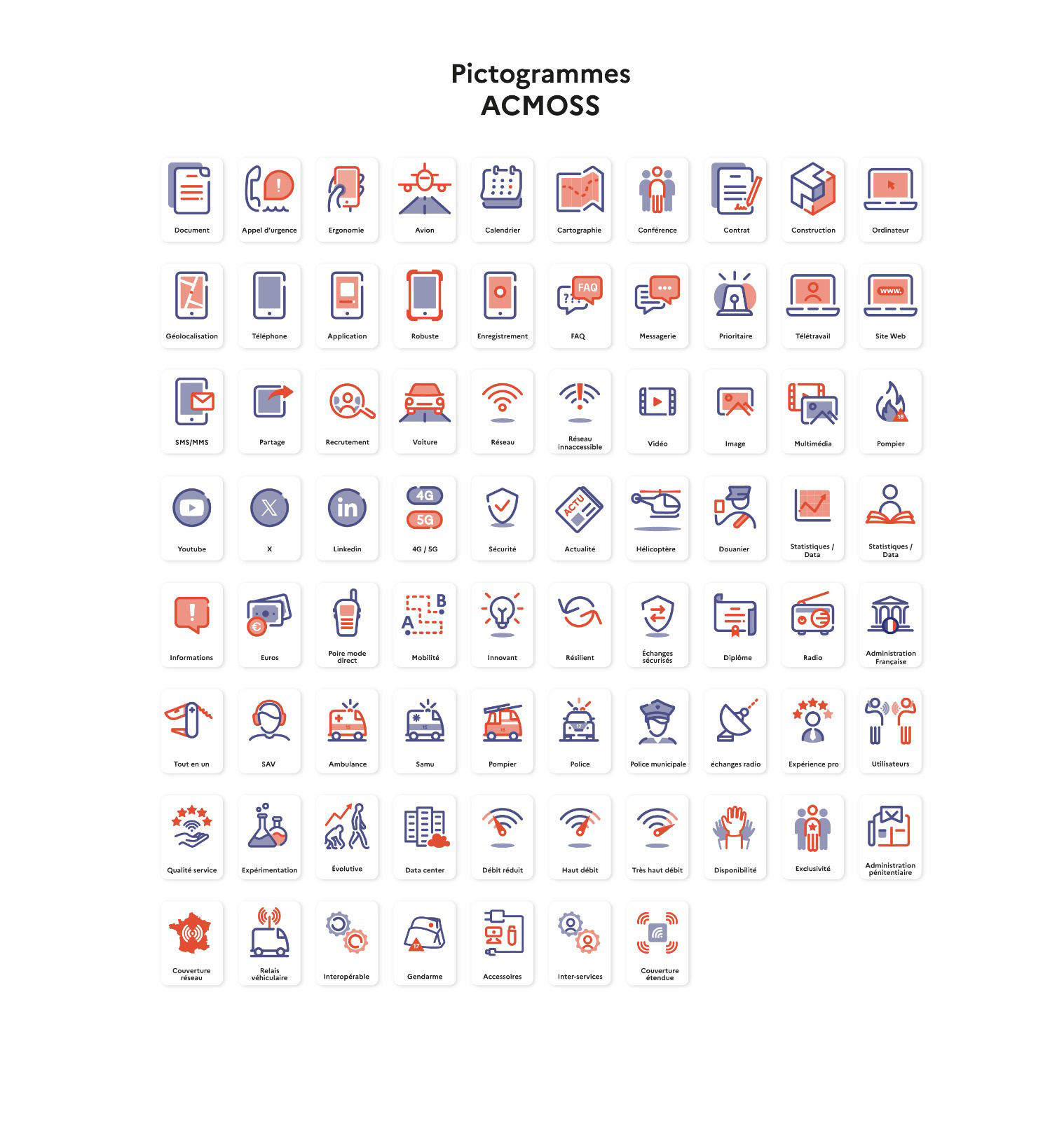 Nous avons conçu un univers visuel structuré qui renforce l’ancrage de l’ACMOSS au sein des services de l’État, en intégrant les couleurs et codes officiels pour affirmer son rôle stratégique dans les communications de sécurité et de secours. Le logo ACMOSS a été repensé pour gagner en impact et en clarté, tout en conservant des éléments du précédent afin de ne pas déstabiliser ses partenaires historiques.
